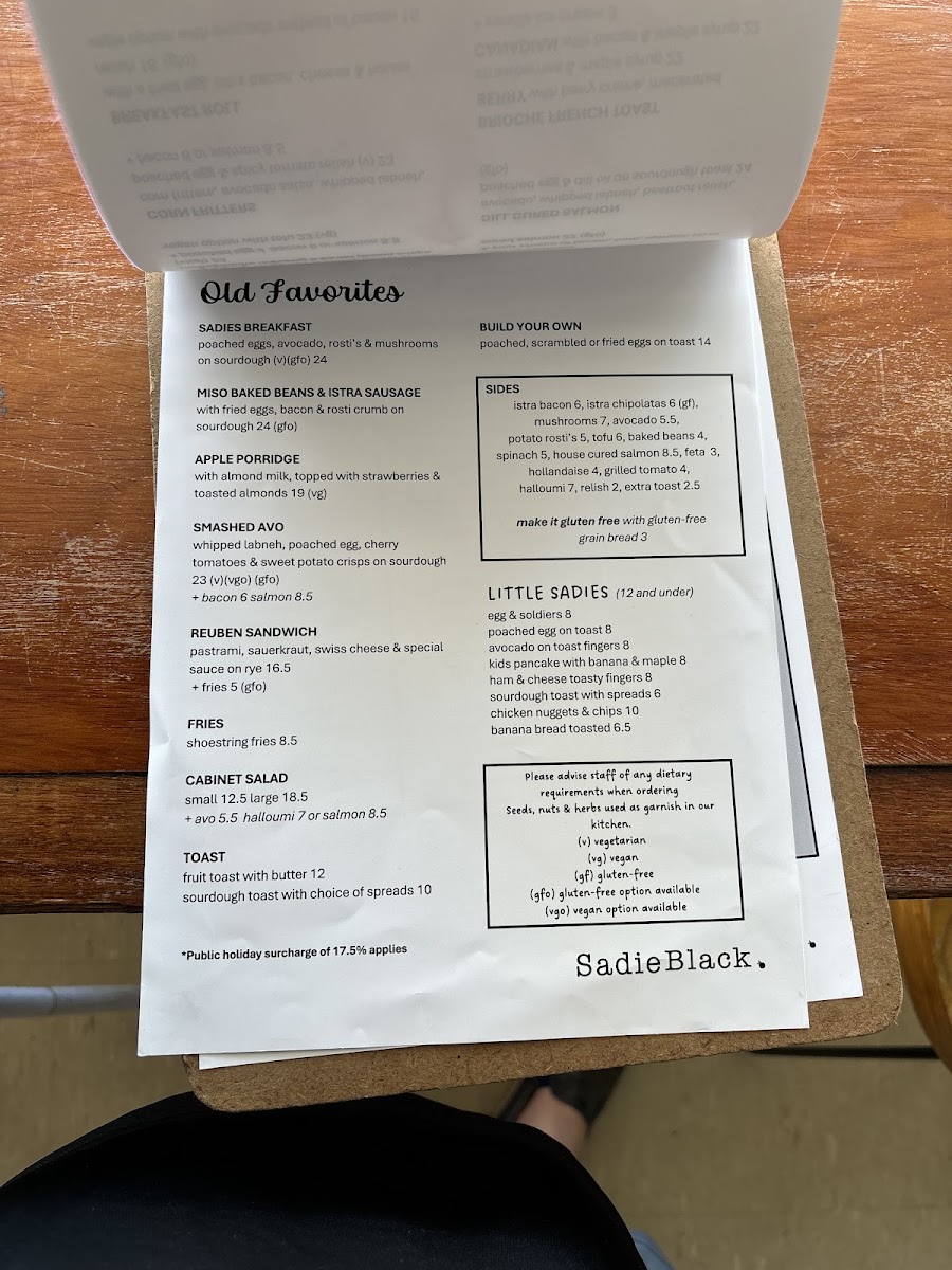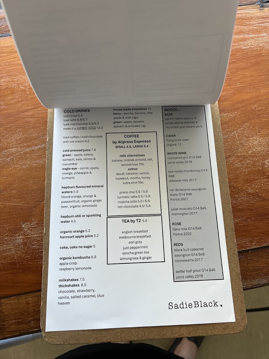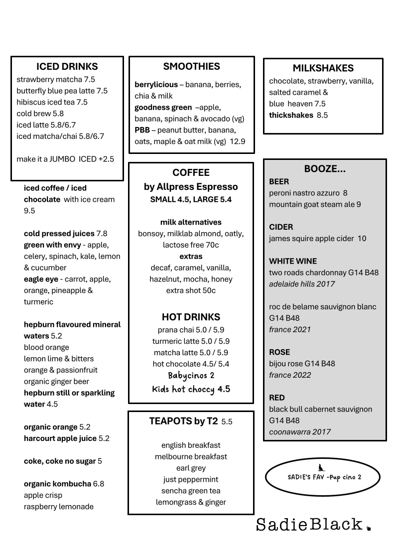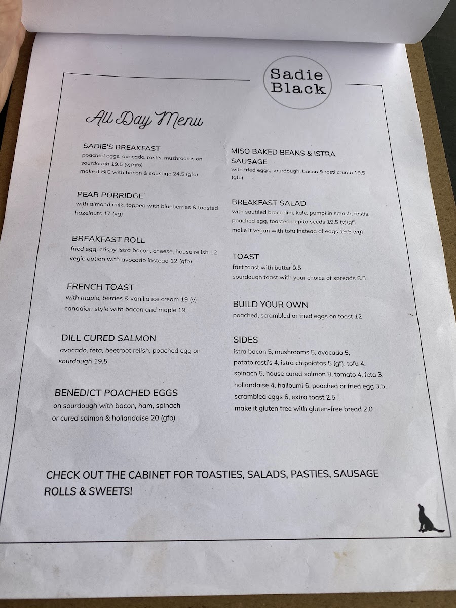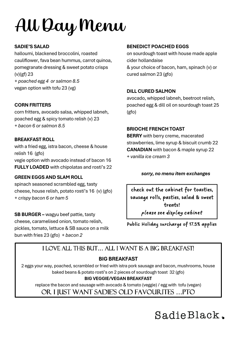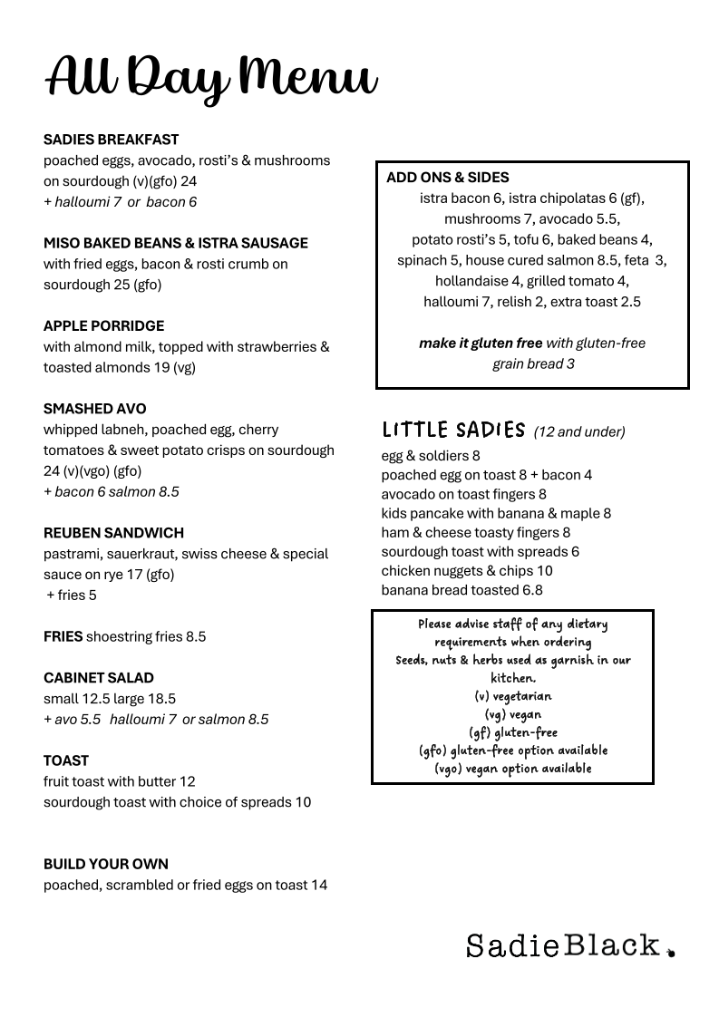 The menu at Sadie Black Cafe reflects a perfect balance between sweet and savory, with each dish thoughtfully crafted to deliver a memorable dining experience. Whether you're in the mood for something light or filling, the All Day Menu has something to suit every craving.
